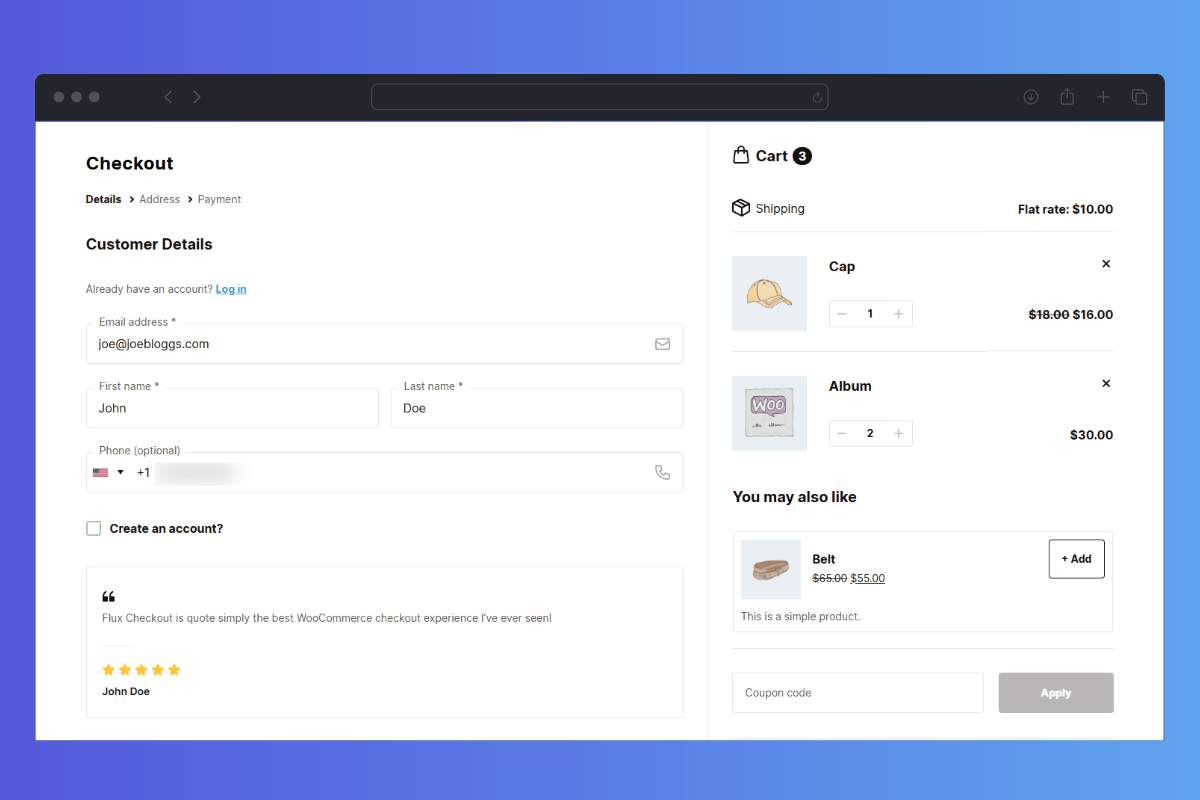 Flux Checkout provides customization options for the checkout page to strip away everything distracting and presents a clean, focused checkout experience.