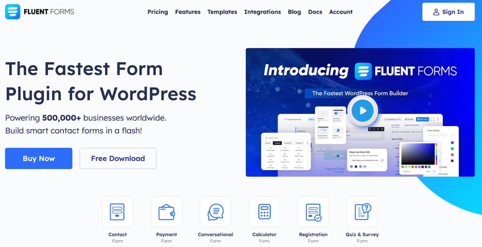 Fluent Forms is the fastest and most user-friendly WordPress form builder plugin that combines simplicity with powerful features, making it a top choice for both beginners and advanced users. With over 500,000 active installations, this drag-and-drop form plugin allows you to create smart forms with ease.