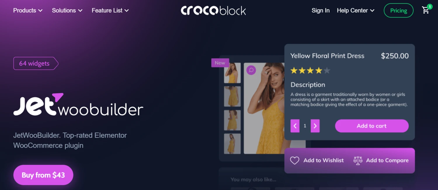 JetWooBuilder is a Crocoblock plugin that allows you to create fully customized WooCommerce pages in Elementor. It gives you control over shop pages, single product templates, cart, checkout, account, and success pages, helping you design visually appealing and highly functional layouts tailored to your store.