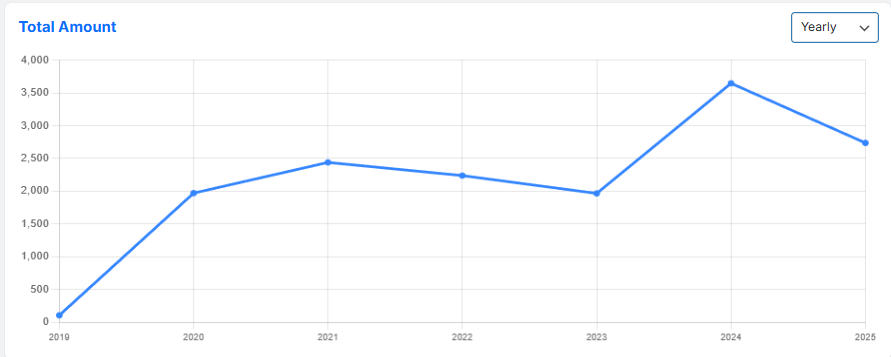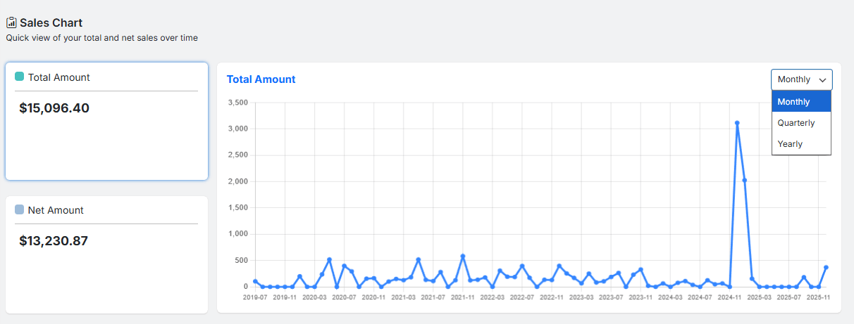 Located below the cards, the chart area visually shows the changes of each metric over time when you click on any card. You can typically switch between a bar chart (good for comparing discrete periods) and a line chart (ideal for showing continuous trends). You can also use the chart’s dropdown menu to change the date range (e.g., from “Monthly” to “Yearly”) to zoom in or out on the data pattern.