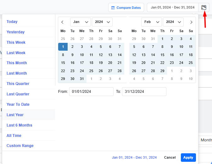 - Choose a preset date like This Week, Last month, Last year, etc.