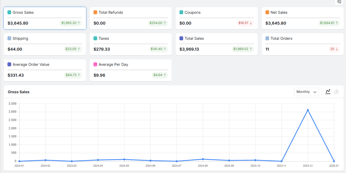 A reliable comparison of seasonal and year-over-year sales performance needs clean, consistent data. WooCommerce’s built-in analytics provide initial information, which is not precise enough for seasonal sales analysis or year-over-year sales comparison.
