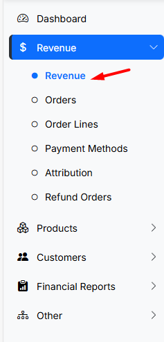 Navigate to the main report’s menu in the plugin. Open the Revenue tab and select the Revenue report.