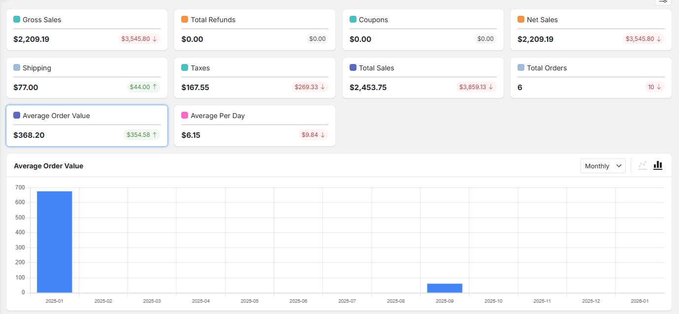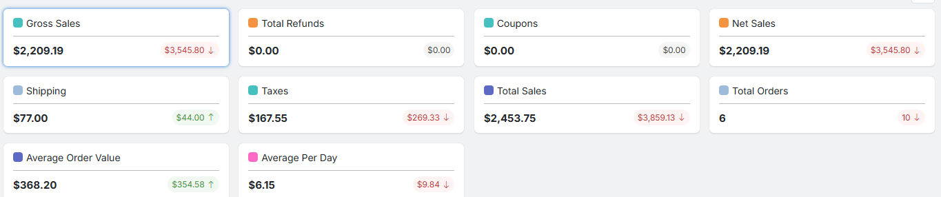 This section provides an instant, visual summary of your key metrics like Net Sales, Total Orders, and Average Order Value (AOV). The comparative numbers are color-coded: a green figure indicates an increase, while a red figure indicates a decrease. This allows for immediate, at-a-glance performance assessment.