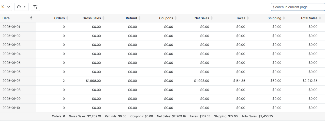 3. Detailed Data Table: This is your granular data workspace. The table breaks down important metrics (like items sold, discounts, refunds) date-by-date for the selected period.
