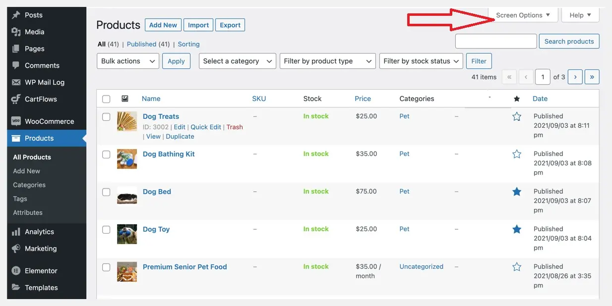 By default, WooCommerce displays 20 products per page. If the number of products available on your site is more, find the screen options tab in the upper right corner and click on it.