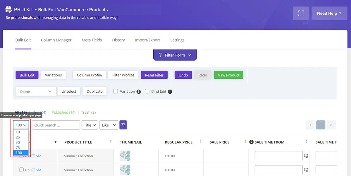 Then you can run this plugin to see the list of products displayed as a table. To bulk delete all products, you must first display all of them in the product table of this plugin. For this, just set the pagination box to 100.