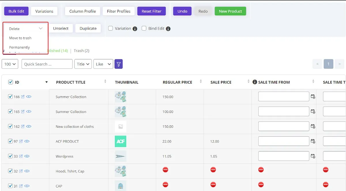 It’s important to note that even though we’ve moved the products to the trash, they haven’t been completely removed yet. To complete the bulk delete process, go to “Trash” and again select all products through the checkbox and delete them.