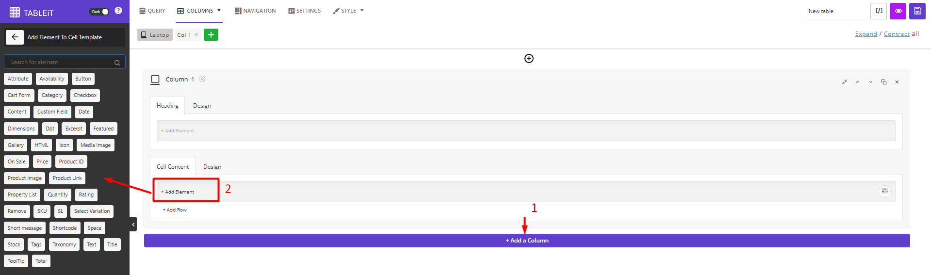 Just like the cell content, you can customize the title of the column by pressing Add element in the Header section and choosing one of the elements like Text, Image, etc. From the list.