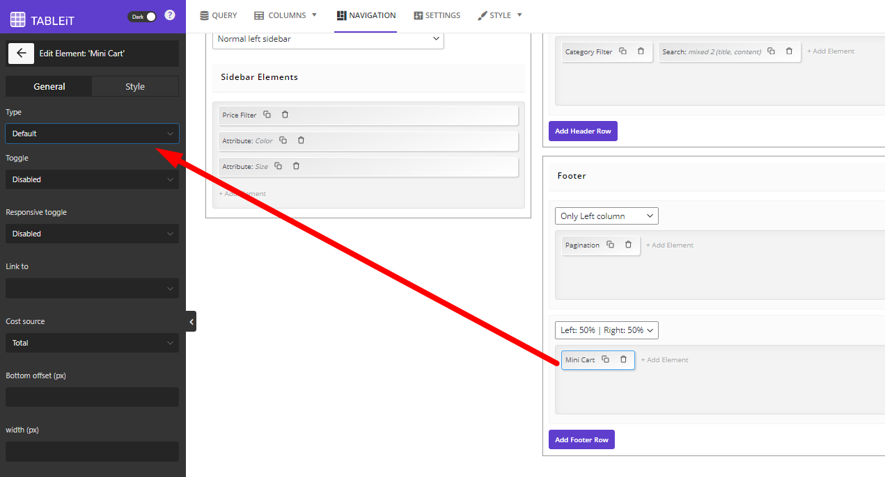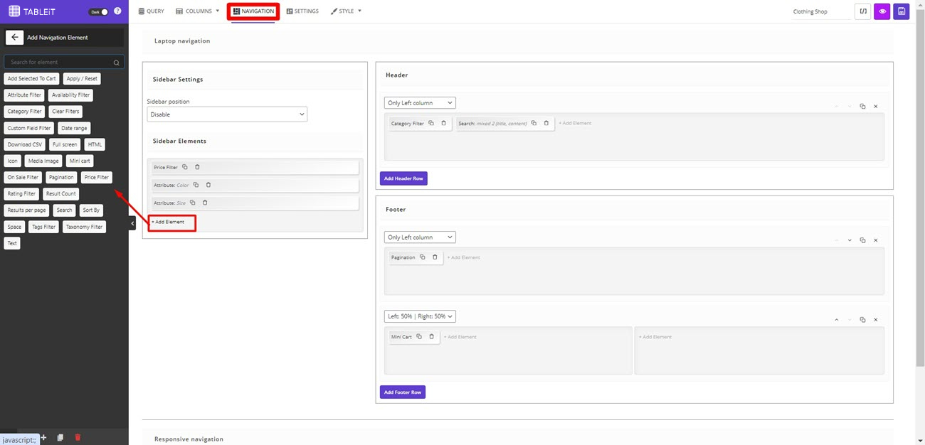 - In the Navigation tab: Choose the Add Selected To Cart element from the list in one of the navigation areas.