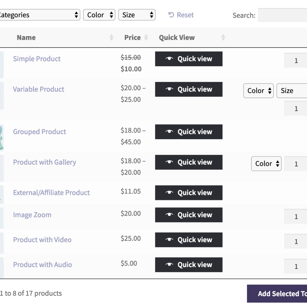 - View and select product variations (such as colors and sizes) without visiting each product page.