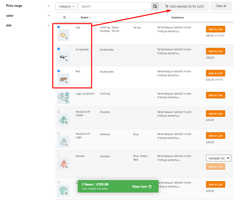 It’s very common for customers if they want to order more than one item from your clothing store. So, they need an option to easily select some products and then add them to their carts with one click. You can make this happen, by adding a multi add to cart option to your clothing store and making a product table with add multiple products to to cart ability.