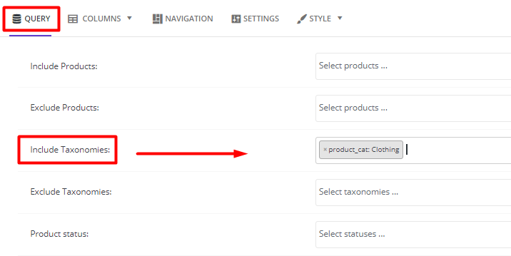 To fulfill the purpose of this tutorial, we set the Clothing category for the Include Taxonomies field which means customers can only see the products in the Clothing category in this product table.