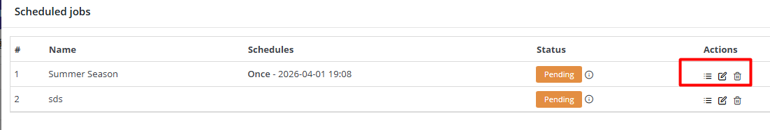 To make any changes, you have access to the following icons in the scheduled jobs list: