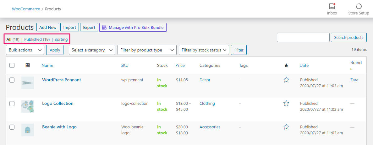There is some status for shop’s products above the WooCommerce Default Product List that allow you to filter products based on status.