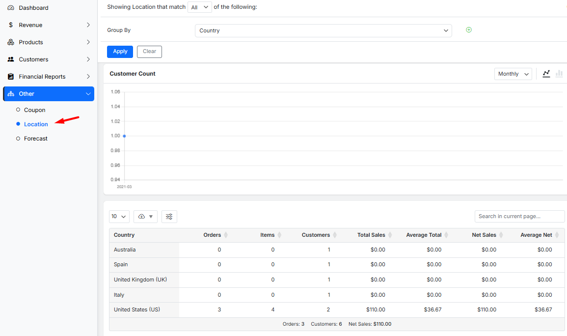 It is also possible to receive a Geographical report by opening the Other menu and choosing Location from the options.