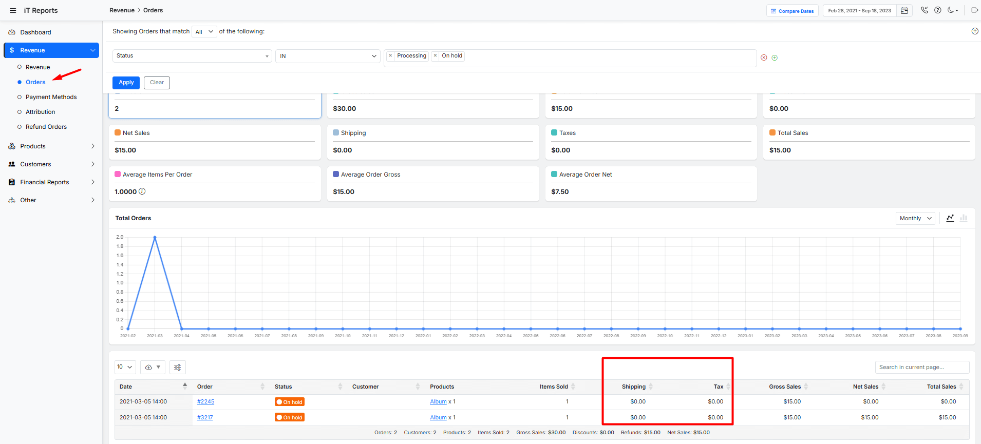 You can review the data related to the tax and Shipping in the Orders report, as shown below: