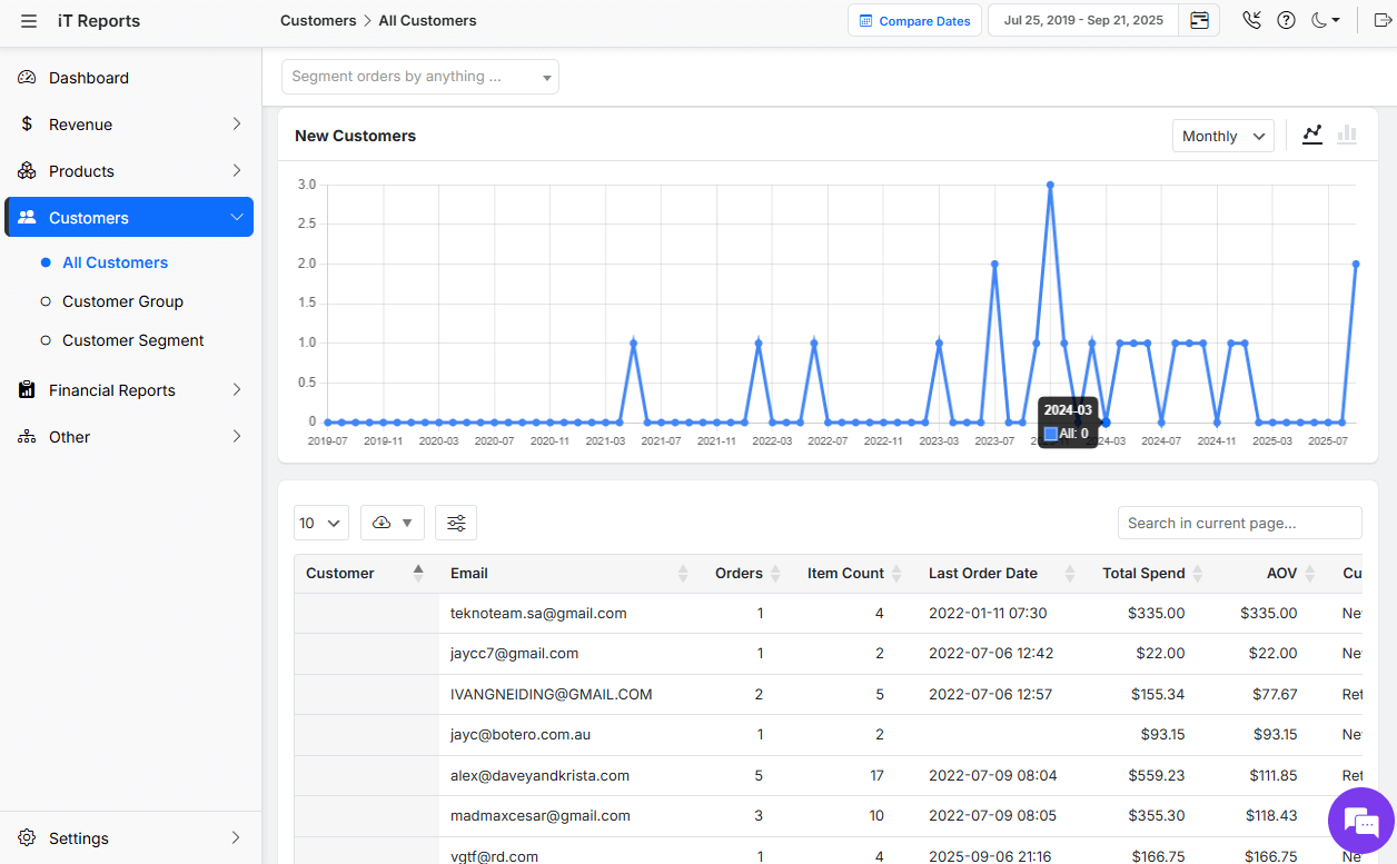Customer reports provide insights into your audience’s behavior and demographics. They include data on customer registrations, order history, geographic location, and customer lifetime value (CLV).