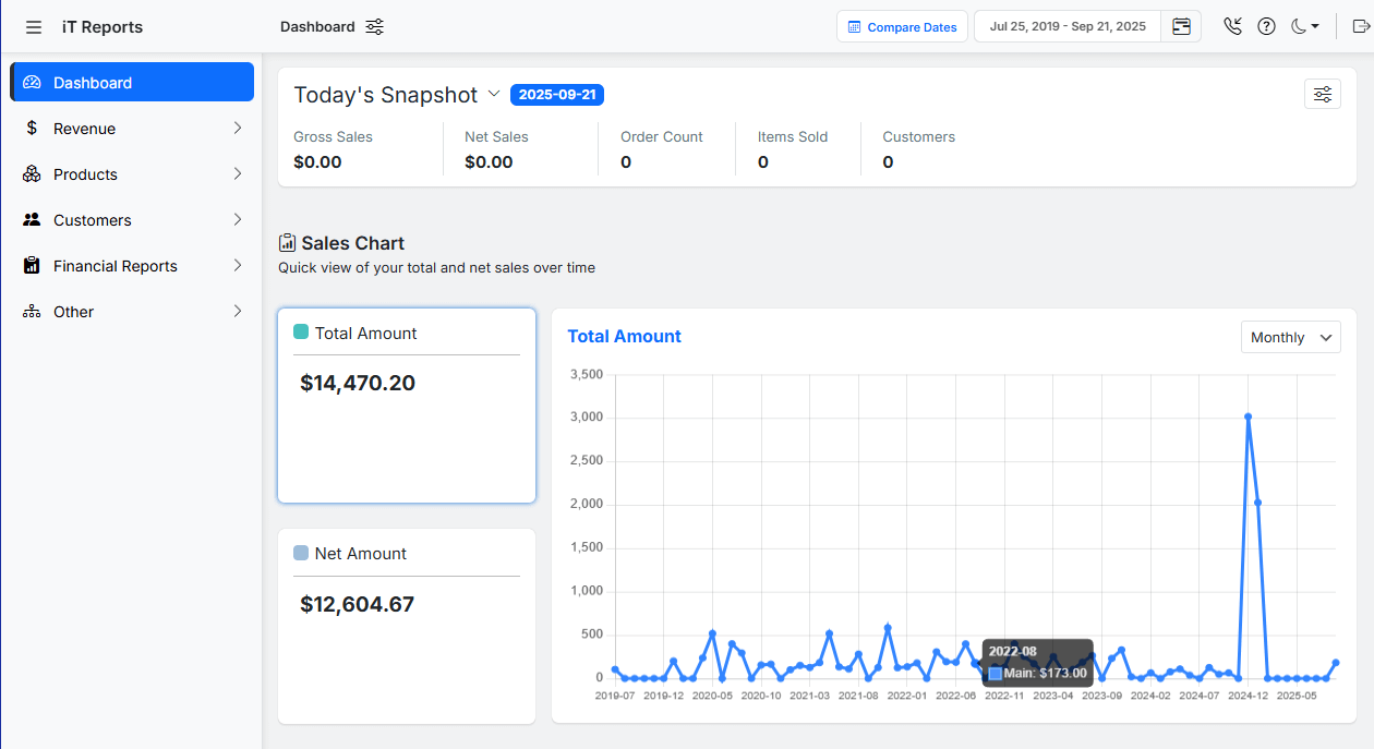 Sales reports offer a comprehensive overview of your store’s financial performance. In this report, you can track useful metrics over specific periods (daily, weekly, monthly, or custom ranges) like:
