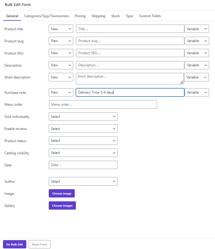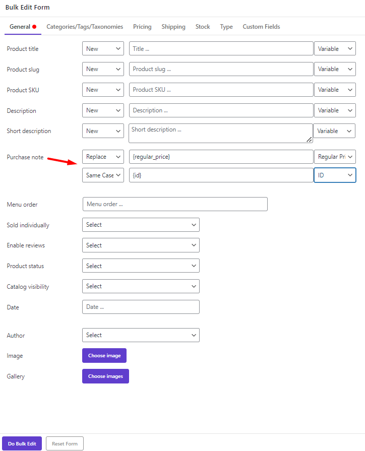 Here, you can find some examples of how to bulk edit product purchase notes with the options in the bulk edit form.