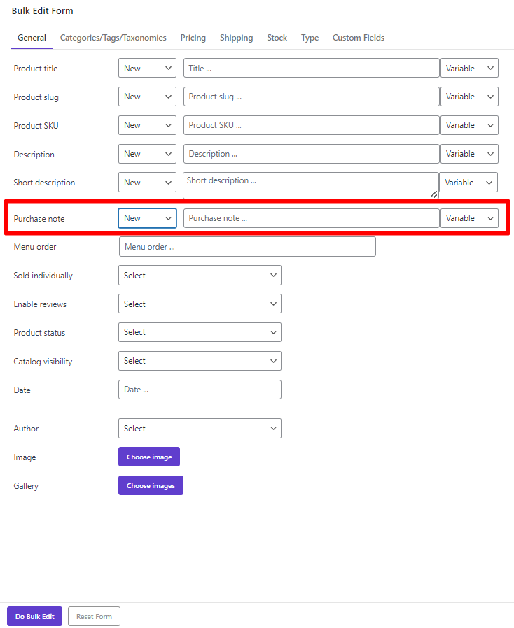 The most practical method for bulk editing product purchase note in WooCommerce is using the Bulk Edit form.