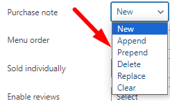 - Append: To add a text at the end of the WooCommerce purchase note.