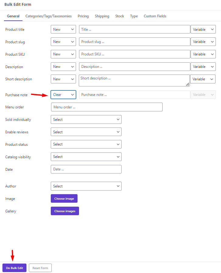 - Choose Clear from the operator box of the Purchase note in the Bulk Edit form.