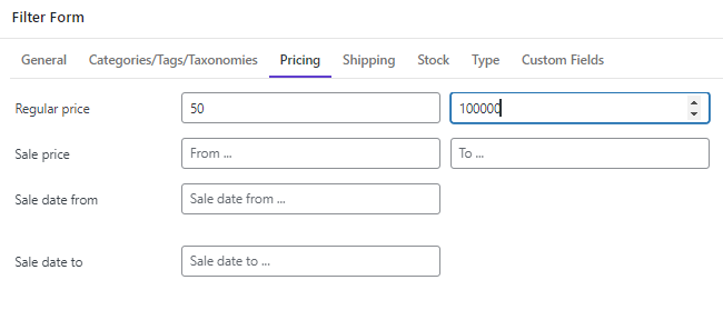 - Open the Filter Form go to the Pricing tab, and set the Regular price from 50 to 100000.