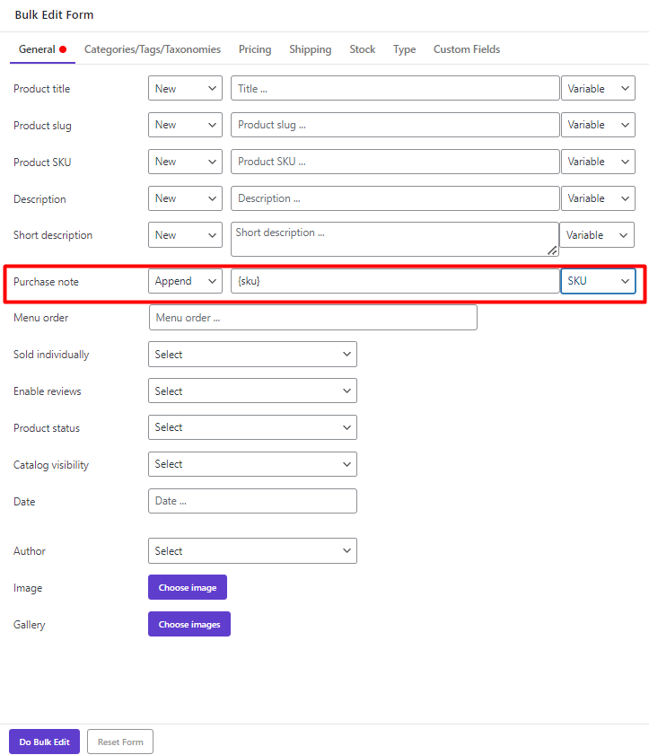 - Press the Do bulk Edit button and you can see the SKU will be added to the end of purchase note field.