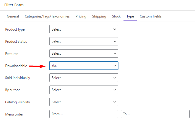 - Go to the Type tab of Filter Form and set Yes for Downloadable field.