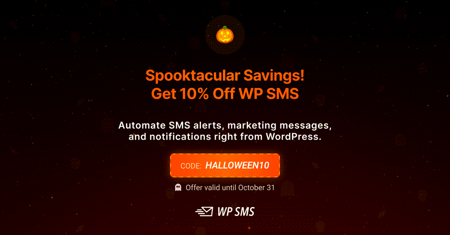 WP SMS is a powerful WordPress plugin that lets you send text messages directly from your website. Easily notify users, automate marketing messages, and connect with your audience through 300+ SMS gateways worldwide. This Halloween, enjoy 10% off all plans with code HALLOWEEN10 — offer valid until October 31, 2025.