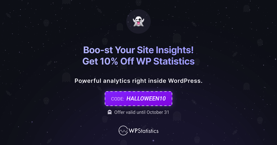 WP Statistics is a leading WordPress analytics plugin that helps you track visitor data right inside your dashboard — no third-party services or tracking scripts required. Gain valuable insights, monitor traffic trends, and make data-driven decisions. This Halloween, get 10% off all plans with code HALLOWEEN10 — valid until October 31, 2025.