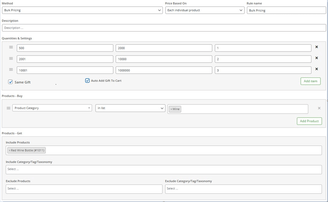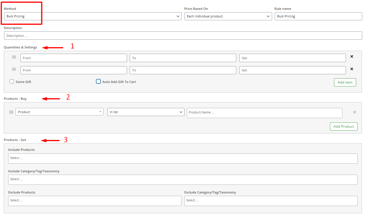 Bulk pricing approach works by defining different price tiers and offering progressively more gifts to incentivize larger orders. To run a bulk pricing promotion in the free gifts for WooCommrce plugin, you must select Bulk Pricing from the list of methods. Then, follow the steps below: