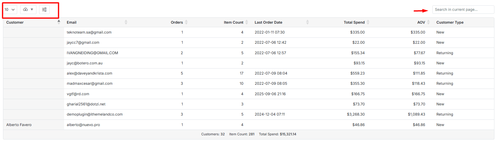 Fully customize this view by showing/hiding columns, adjusting items per page, or using the search function to find a specific customer.