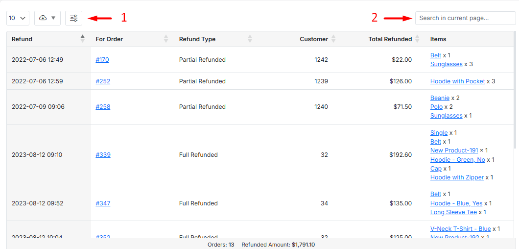 Search and Sort: Sort the table by columns like “Total Refunded” to quickly identify the largest refunds. Use the Search box to find specific orders or customers.