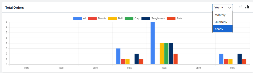 You can adjust the time interval using the dropdown menu to view trends on a Monthly, Quarterly, or Yearly basis. This helps you see broader patterns that might be missed in a daily view.